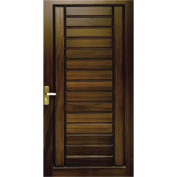 This design focuses on clean lines and a rich chocolate walnut tone. The center of the door is composed of a long vertical stack of thick, horizontal beveled slats, framed by two smooth vertical side panels that emphasize the height and sturdiness of the door.